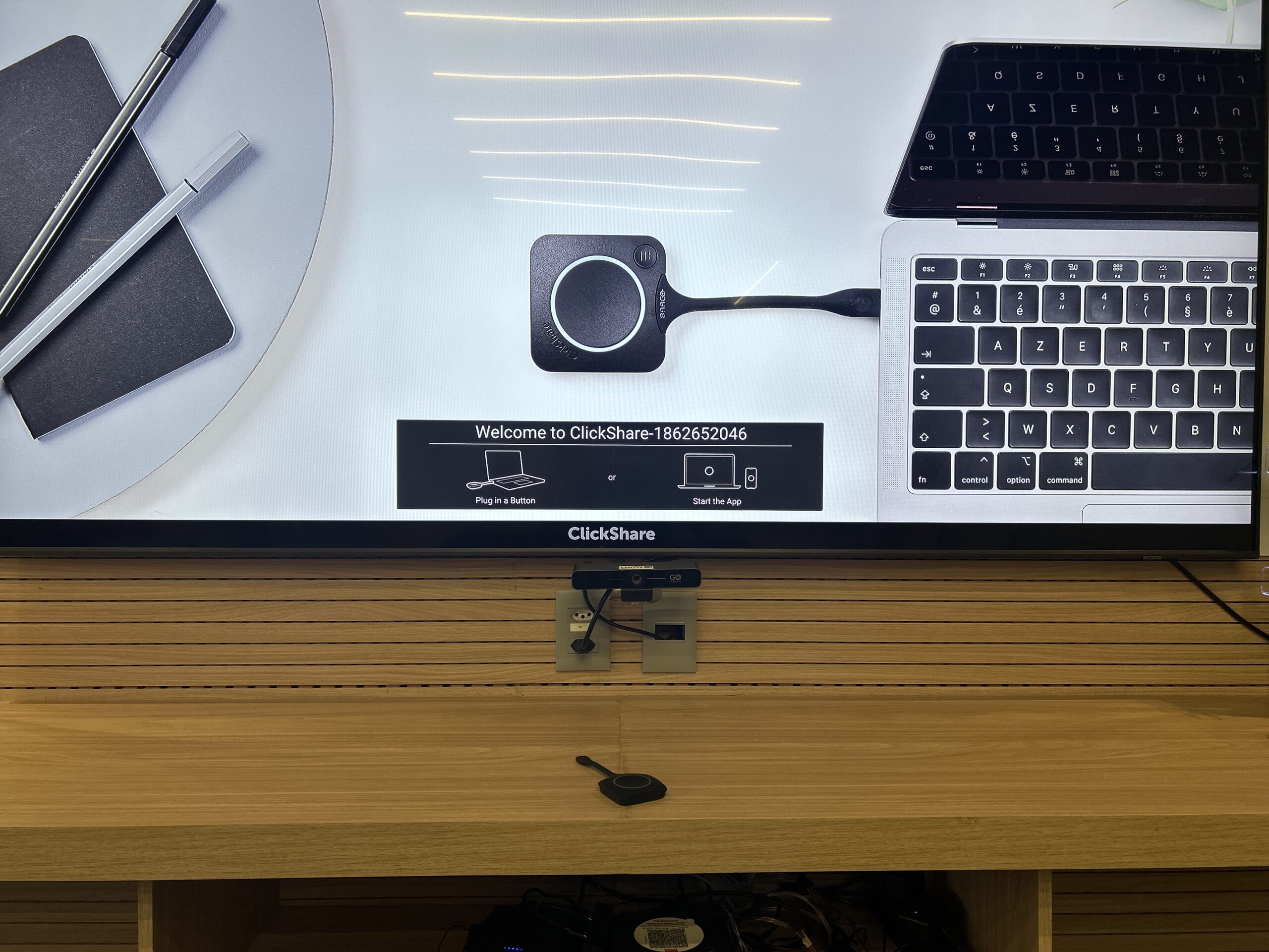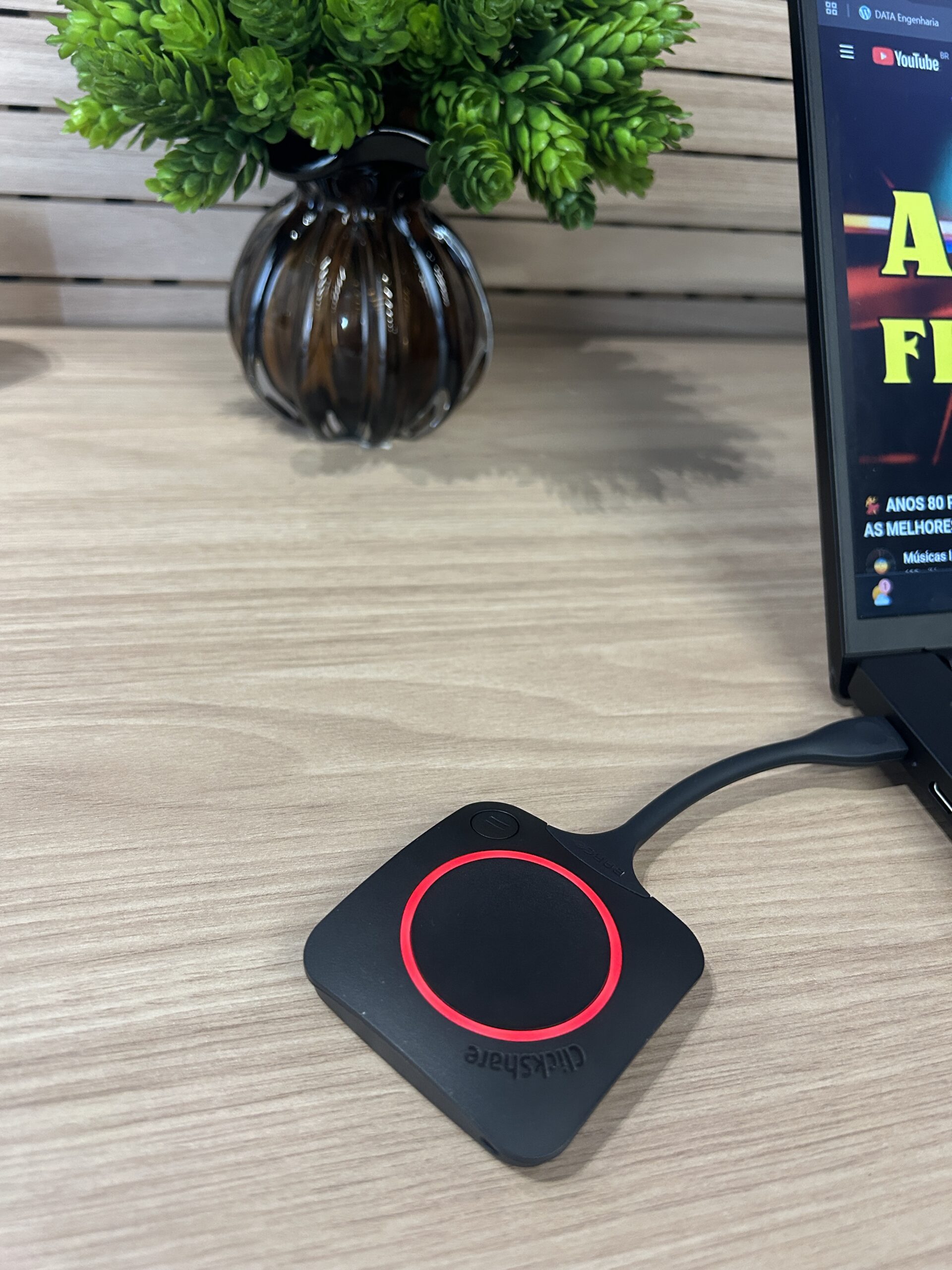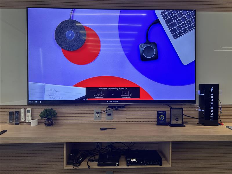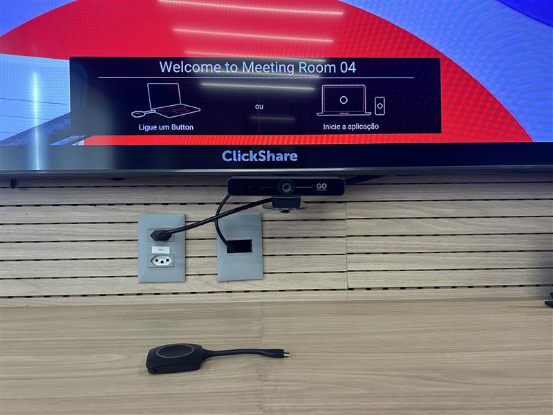 • Compartilhador sem fio Barco ClickShare CX20, permitindo apresentações rápidas e sem cabos, com conexão simples para qualquer participante.