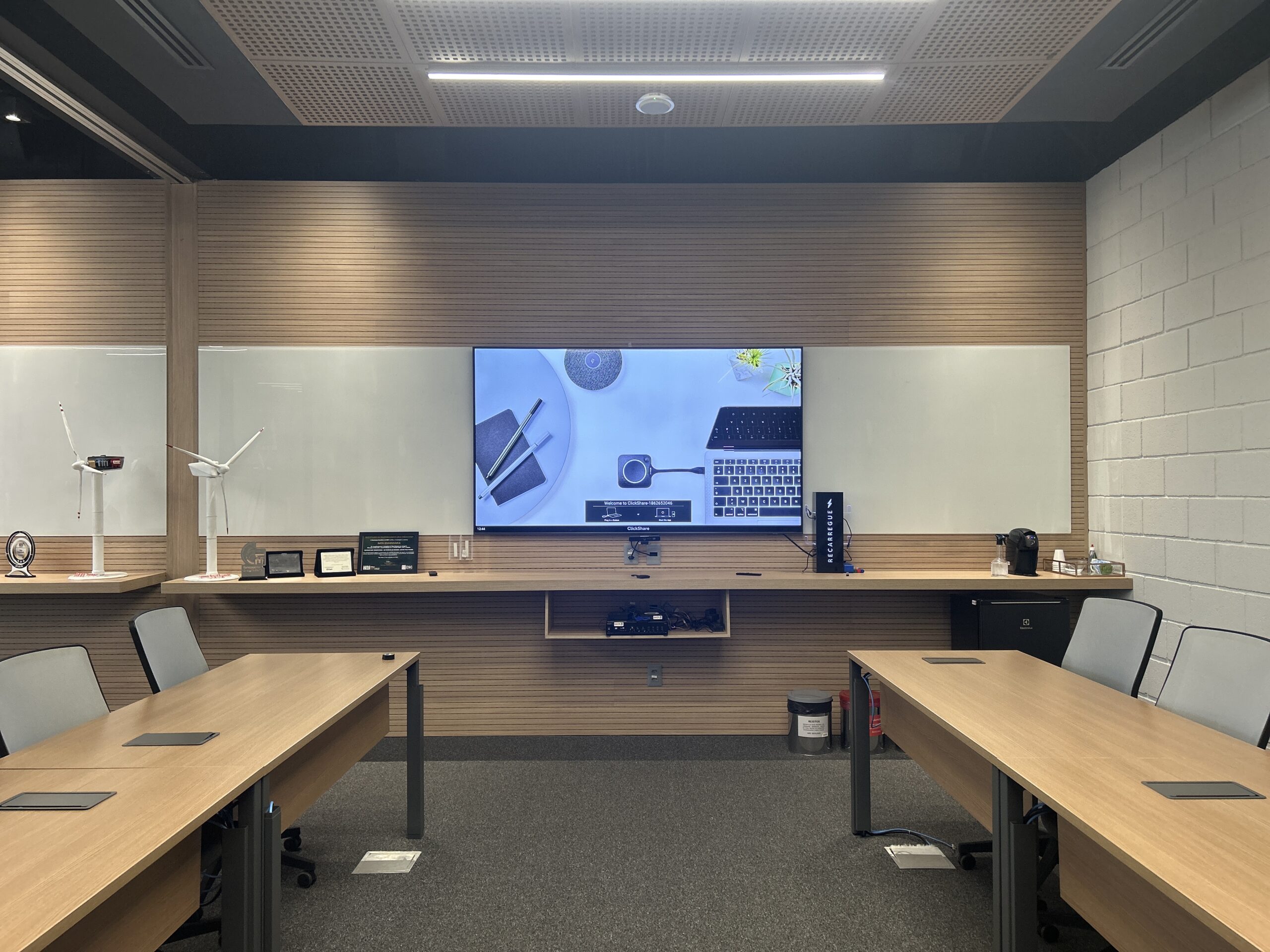 O objetivo era transformar uma grande sala em um ambiente tecnológico, capaz de atender diferentes formatos de encontros. Além disso, o espaço possui uma característica especial: ele pode ser dividido em dois ambientes independentes por meio de uma divisória retrátil.